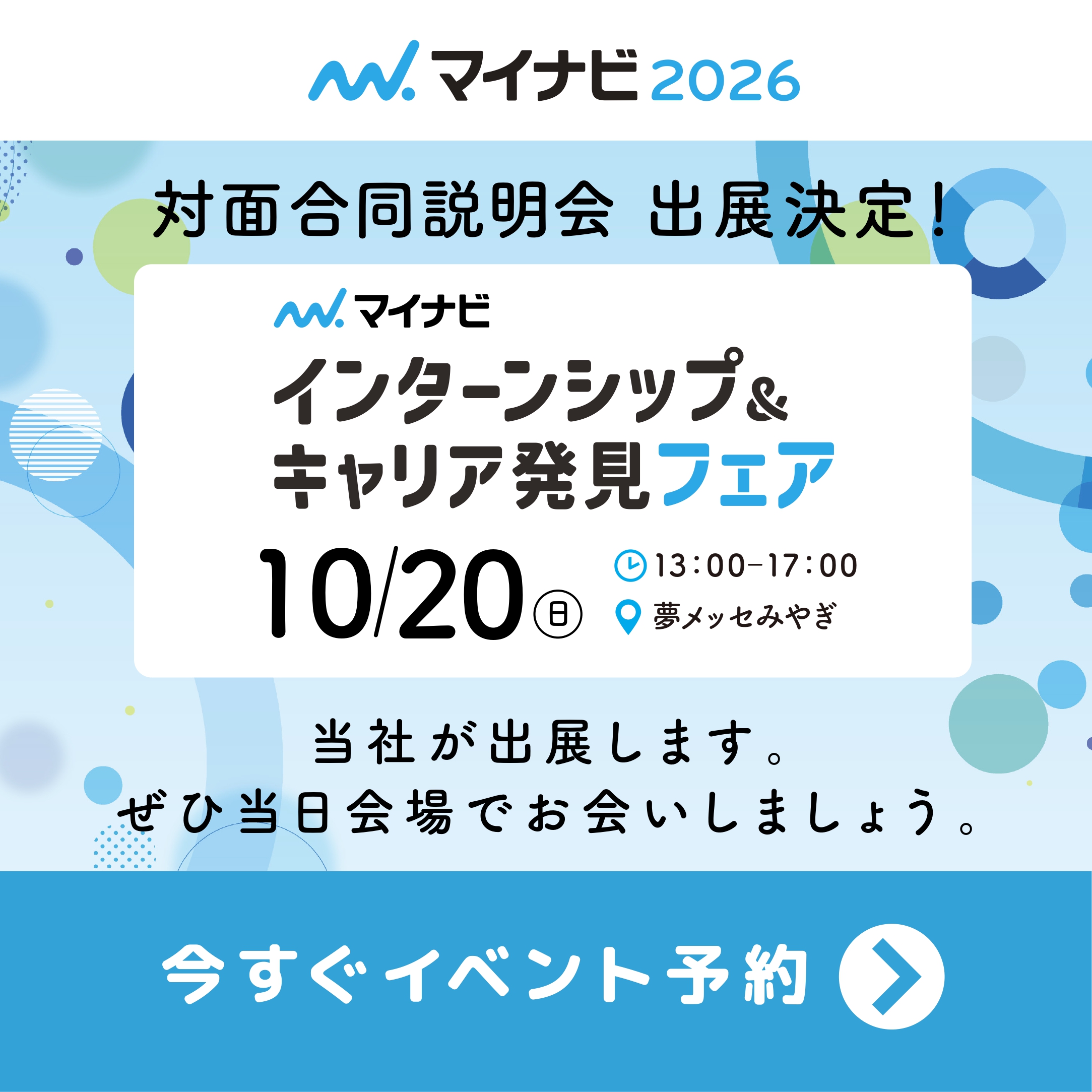 10月20日(日)夢メッセみやぎにて行われる『マイナビインターンシップ&キャリア発見フェア』に出展します!ぜひ当社ブースへお立ち寄りください!